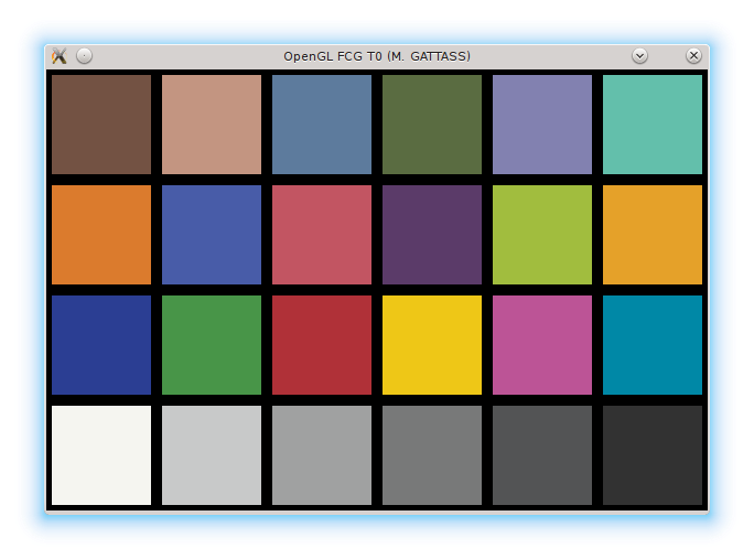 Finalmente as 24 cores são exibidas na tela no formato do Macbeth ColorChecker, renderizadas utilizando comandos OpenGL chamados a partir de um software