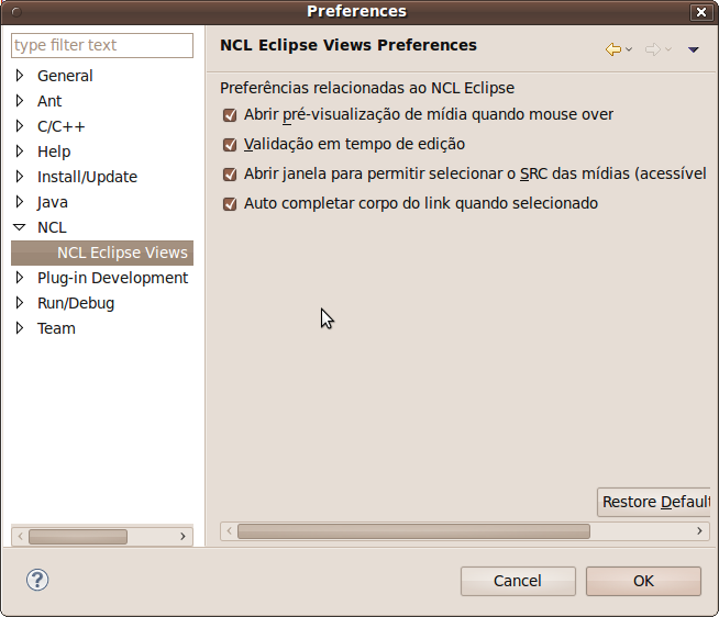 Para isso, acesse Window→Preferences→NCL→NCL Eclipse Views.
